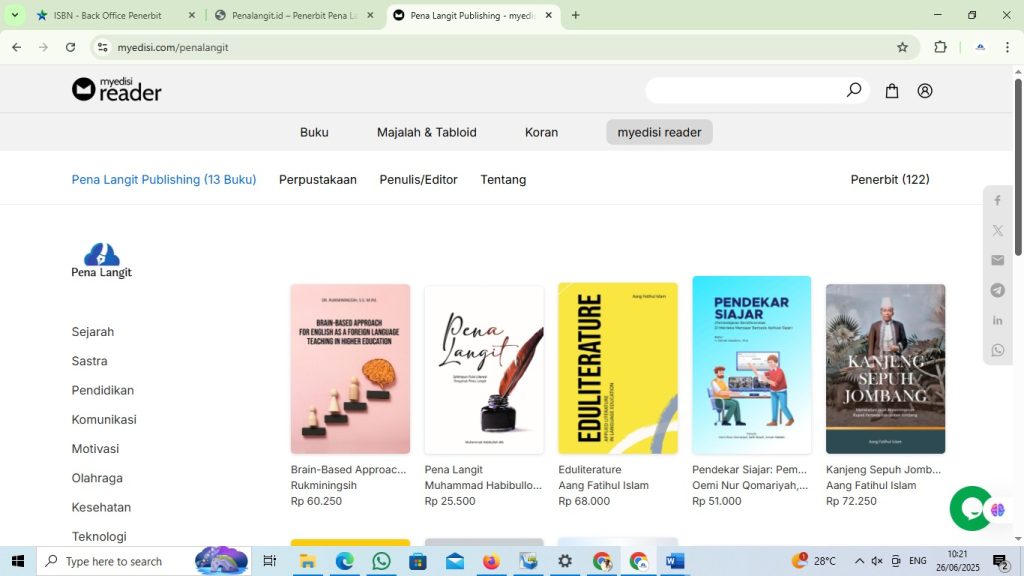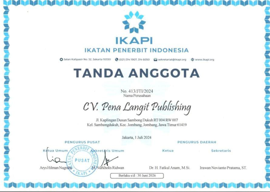 (1) memiliki redaksi yang professional sesuai bidangnya, antara lain: editor, layouter, desain cover, content creator dan marketing, (2) telah terdaftar sebagai angota Ikatan Penerbit Indonesia (IKAPI) jawa Timur dengan nomor anggota 413/JTI/2024, (3) telah menerbitkan beberapa genre buku; buku referensi, monograf, buku sejarah, buku parenting, buku cerita inspirasi, book chapter, dan sastra, (4) mendirikan jurnal ilmiah dengan laman domain: ejournal.penalangit.id, saat ini sudah berdiri beberapa jurnal ilmiah dan satu jurnal internasional Kerjasama dengan ICEPD Thailand, antara lain: IJLEAL (Indonesian Journal of Language Education, Applied Linguistics and Literature) dengan url: https://ejournal.penalangit.id/index.php/ijleall/about, JISS (Journal of Indonesian Sport Science) dengan url: https://ejournal.penalangit.id/index.php/jiss/about, IJBE (Indonesian Journal of Business and Economics) dengan url: https://ejournal.penalangit.id/index.php/ijbe/about dan PELAPIS: Jurnal Pengabdian Masyarakat dengan url: https://ejournal.penalangit.id/index.php/pelapis. Jurnal Internasional kerjasama dengan ICEPD Thailand sebagai Publisher dengan nama jurnal IJGLOMI (International Journal Global of Multidisciplinary Innovations) dengan url: https://www.icepd-ojs.org/index.php/ijglomi/index. Kelima Jurnal ilmiah ini dikelolah oleh editor profesional dan praktisi jurnal ilmiah yang melibatkan reviewer sesuai dengan kepakarannya. Kemungkinan besar jurnal ini akan terus berkembang sesuai kebutuhan (5) gagasan Desain Kreatif Literasi (Creative Literacy Design) yang saat ini sudah dimulai dengan pengadaan kaos literasi Pena langit Publishing untuk redaksi Pena Langit Publishing. Pilot project ini akan terus dikembangkan sesuai pangsa pasar dan tren yang berkembang, (6) membangun trust sehingga dipercaya oleh para penulis professional mulai dari Doktor hingga Profesor, Perguruan Tinggi hingga Pemerintahan, hingga saat ini sudah menerbitkan buku dari berbagai penulsi Perguruan Tinggi baik Negeri maupun Swasta dan juga project Pemerintah Daerah dan (7) bekerjasama dengan berbagai pihak lintas sektoral untuk memperluas jaringan, (8) pengembangan publikasi dan penjualan digital secara profesional. Sebagai upaya pengembangan publikasi dan penjualan digital bulan Juni 2025 ini Pena Langit Publishing bekerjasama dengan PT Myedisi Interaktif Media dengan url: https://www.myedisi.com/penalangit Sertifikat Anggota IKAPI