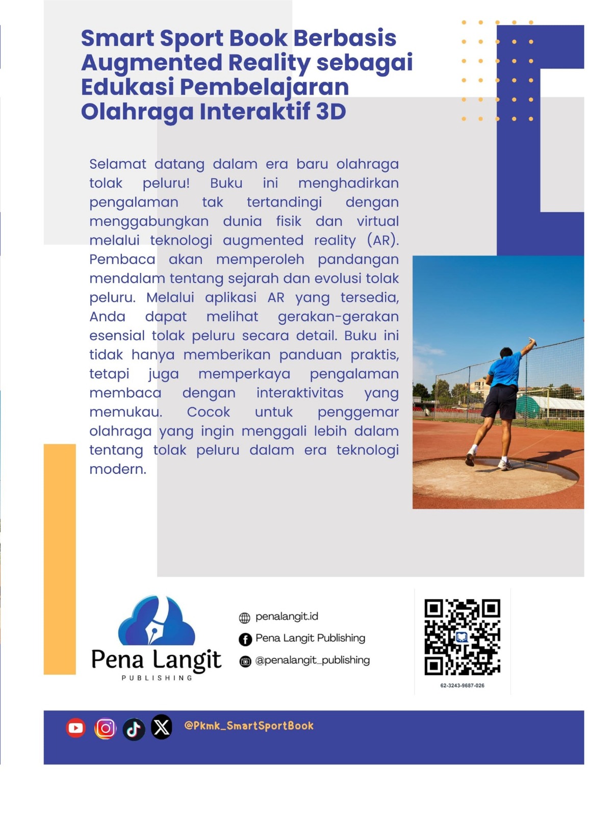 Selamat datang dalam era baru olahraga tolak peluru! Buku ini menghadirkan pengalaman tak tertandingi dengan menggabungkan dunia fisik dan virtual melalui teknologi augmented reality (AR). Pembaca akan memperoleh pandangan mendalam tentang sejarah dan evolusi tolak peluru. Melalui aplikasi AR yang tersedia, Anda dapat melihat gerakan-gerakan esensial tolak peluru secara detail. Buku ini tidak hanya memberikan panduan praktis, tetapi juga memperkaya pengalaman membaca dengan interaktivitas yang memukau. Cocok untuk penggemar olahraga yang ingin menggali lebih dalam tentang tolak peluru dalam era teknologi modern.