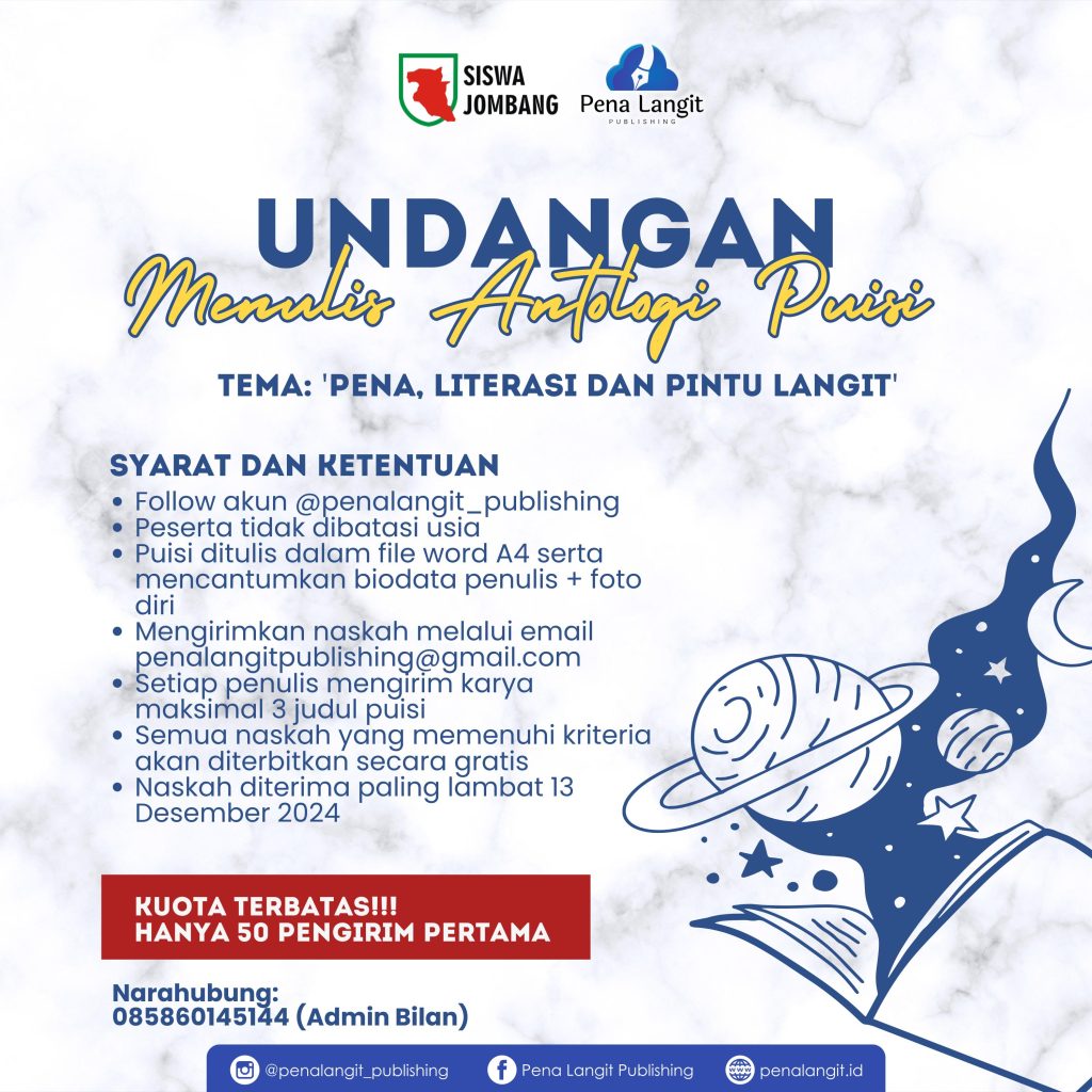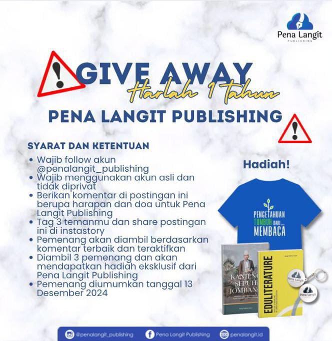 Jombang, 13 Desember 2024 – Tepat 1 tahun hari lahir, Pena Langit Publishing menyelenggarakan beberapa kegiatan menarik, Adapun kegiatan tersebut antara lain: give away harlah 1 tahun Pena Langit Publishing melalui akun IG @penalangit_publishing yang akan diambil 3 pemenang berdasarkan komentar terbaik dan teraktifkan.